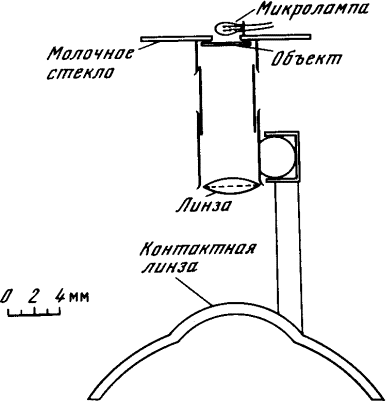 Чрезвычайно интересно, как расположены окончания зрительных волокон в зрительном бугре мозга. Мы уже говорили, что в плане это расположение совпадает с расположением соответствующих ганглиозных клеток в сетчатке. Но, кроме того, оказывается, что окончания волокон каждого типа находятся в зрительном бугре на определенной глубине, так что в мозгу лягушки имеется четыре слоя нейронов, воспринимающих зрительную информацию, и каждый слой как бы получает оттиск сетчатки, но в определенном аспекте соответственно одному из четырех типов ганглиозных клеток. Эти слои и являются датчиками информации для высших отделов мозга. Опыты, подобные описанным, довольно сложны, и по поводу их интерпретации иногда возникают споры. Детали описанной системы могут измениться или получить другое толкование. Тем не менее общий характер системы понятий первого уровня установлен, по-видимому, достаточно твердо. Мы видим переход от точечного описания к локальному, учитывающему непрерывную структуру изображения. Ганглиозные клетки служат распознавателями таких первичных понятий, как край, выпуклость, движение, отнесенных к определенной области видимого мира. 2.7. Обломки системы понятийУ человека понятия нижайшего уровня, относящиеся к зрительному восприятию, вероятно, мало отличаются от понятий лягушки. Во всяком случае, структура сетчатки у млекопитающих и человека такая же, как и у земноводных. Некоторое представление о понятиях следующих уровней иерархии дает явление нарушения восприятия стабилизированного на сетчатке изображения. Это очень интересное явление. Оно состоит в следующем. Когда человек смотрит на неподвижный объект, «фиксирует» его глазами, глазные яблоки не остаются абсолютно неподвижными, а созерцают небольшие непроизвольные движения. В результате изображение объекта на сетчатке находится в постоянном движении, складывающемся из медленного дрейфа и скачкообразных смещений, возвращающих изображение к точке максимальной чувствительности. Оно «топчется на месте» в окрестности этой точки. Можно создать на сетчатке стабилизированное, не топчущееся на месте изображение. Для этого надо, очевидно, чтобы объект был жестко связан с глазным яблоком и двигался вместе с ним. Достигается это так (рис. 2.4). На глаз надевают контактную линзу, к которой прикреплен маленький стерженек. Стерженек несет миниатюрный оптический проектор4, в который можно вставлять диапозитивы размером в несколько миллиметров. Испытуемый видит изображение как удаленное в бесконечность. Так как проектор поворачивается вместе с глазом, изображение на сетчатке неподвижно. При предъявлении испытуемому стабилизированного изображения он в течение первых нескольких секунд воспринимает его как при нормальном зрении, но затем начинаются нарушения. Изображение то исчезает, заменяясь серым или черным фоном, то появляется частями или целиком.